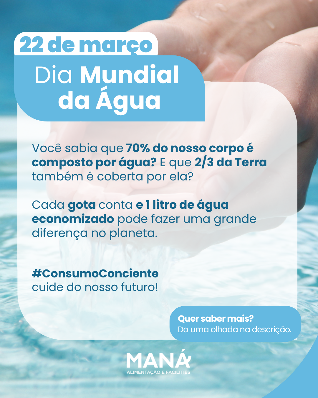 Hoje é o Dia Mundial da Água, e queremos reforçar a importância desse recurso essencial! Nosso corpo é composto por 70% de água, e o